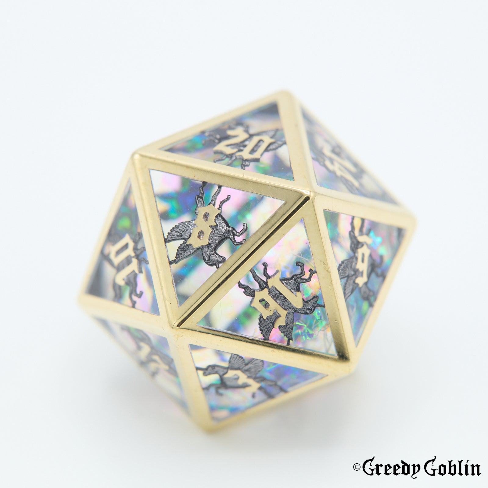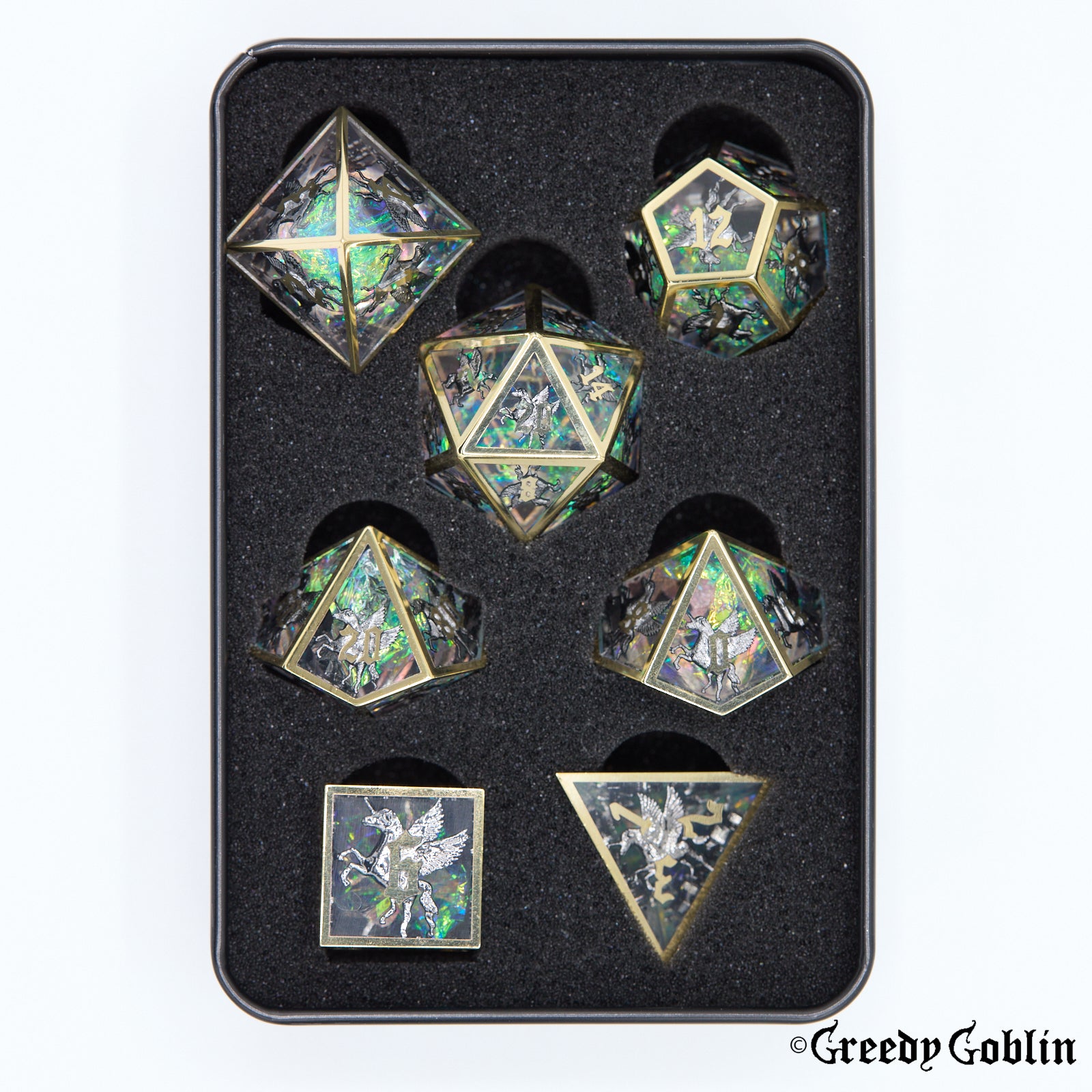 An ornate set, made up of a Golden Frame encasing Pegasus inlays within a clear resin body. Graceful and regal, the perfect set for someone looking to add some flair to their tabletop experience.