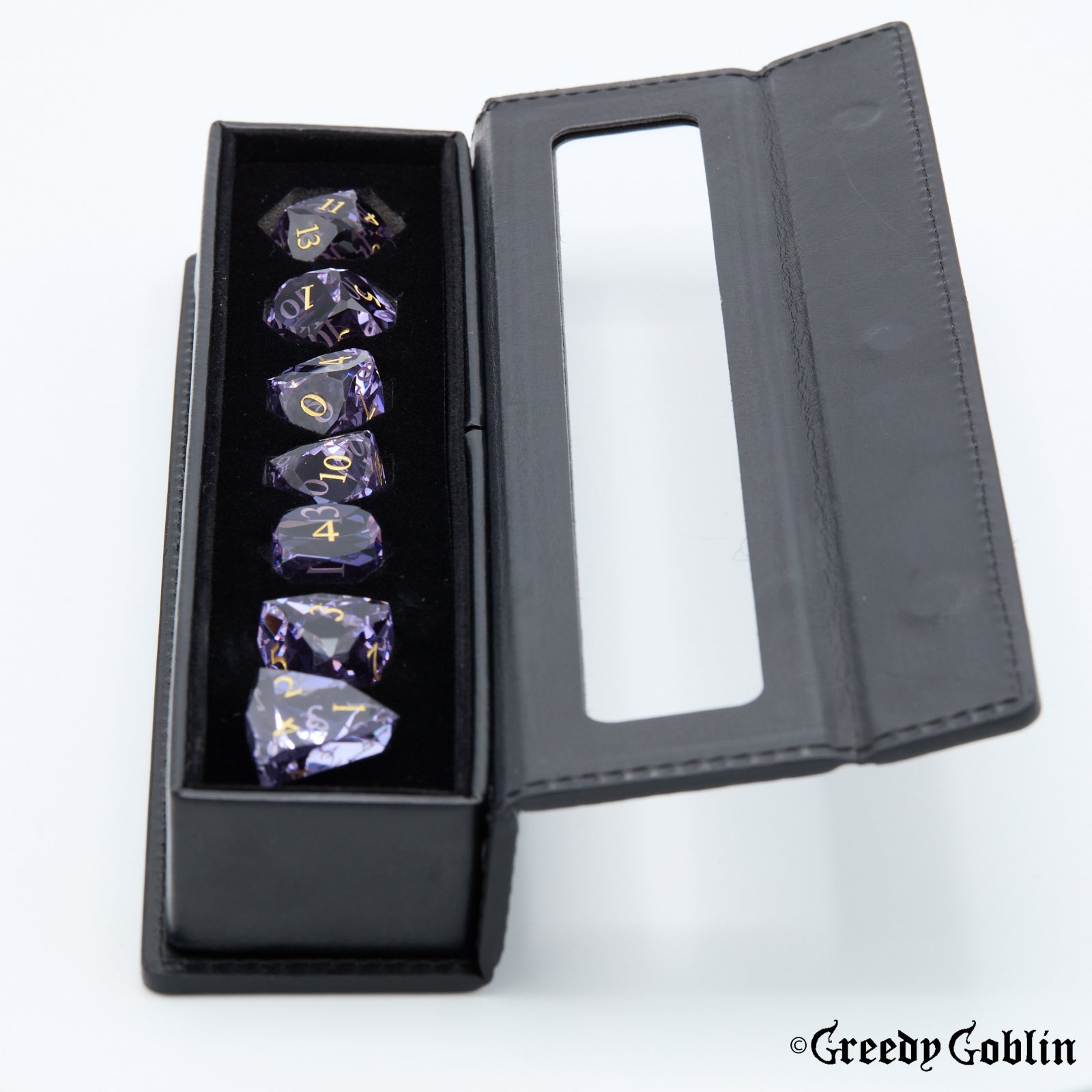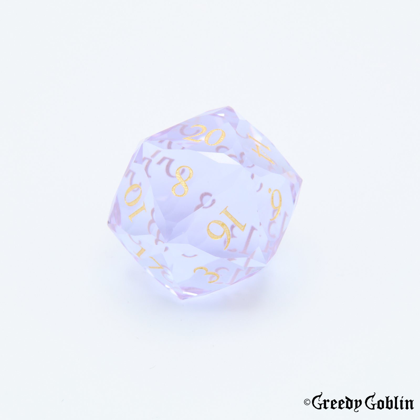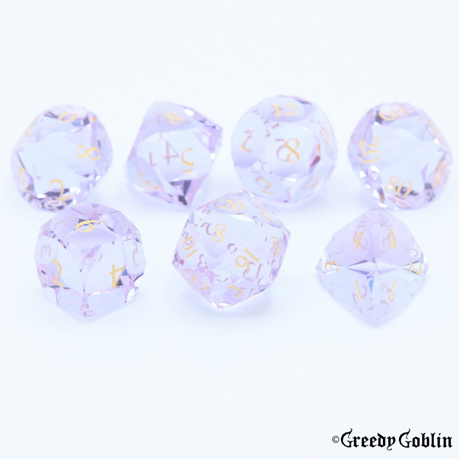 A beautiful glass set of polydice, intricately facetted to ensure you will stand out from your fellow adventurers. The impeccable surface finish makes this both a functional tool for your campaigns, and an amazing display piece for whenever you have a break in the tavern.